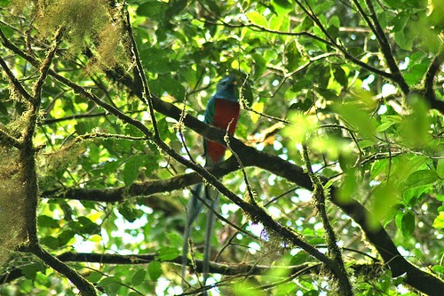 El mascle de quetzal, a part de per les llargues plomes de la cua, es diferencia de la femella pel pit vermell (gris a la femella) i el bec groc. Les fotos no són massa bones (ens tornarem a trobar quetzals, mascles i femelles, més endavant) però serveixen per veure com d'espectacular és aquest ocell.