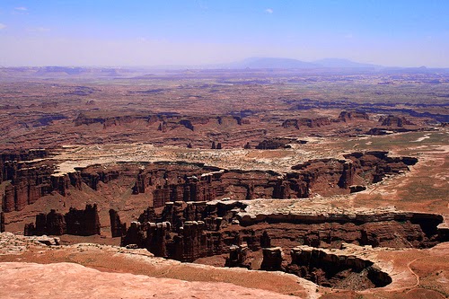 Des del mirador del Grand View Point, es veuen uns canyons profunds per on passa el riu Colorado (tot i que no es pot veure el riu) camí cap al Confluence, el punt on s'ajunta amb el Green River.