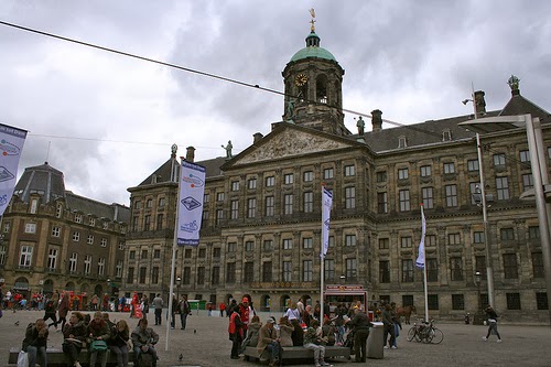 Després del descans, vam deixar la plaça Spui i vam caminar pel Kalverstraat, un carrer comercial molt animat, fins a la plaça Dam, on hi ha el palau reial (Koninklijk Paleis) i la esglèsia nova (Nieuwe kerk). El palau reial, que inicialment es va construir com a ajuntament el 1665, actualment és el domicili oficial de la reina, encara que aquesta viu a La Haia, i és obert al públic la major part de l'any. L'esglèsia nova (nova perquè és un segle més recent que la vella, l'Oude kerk) és l'escenari de les coronacions i les bodes reials.